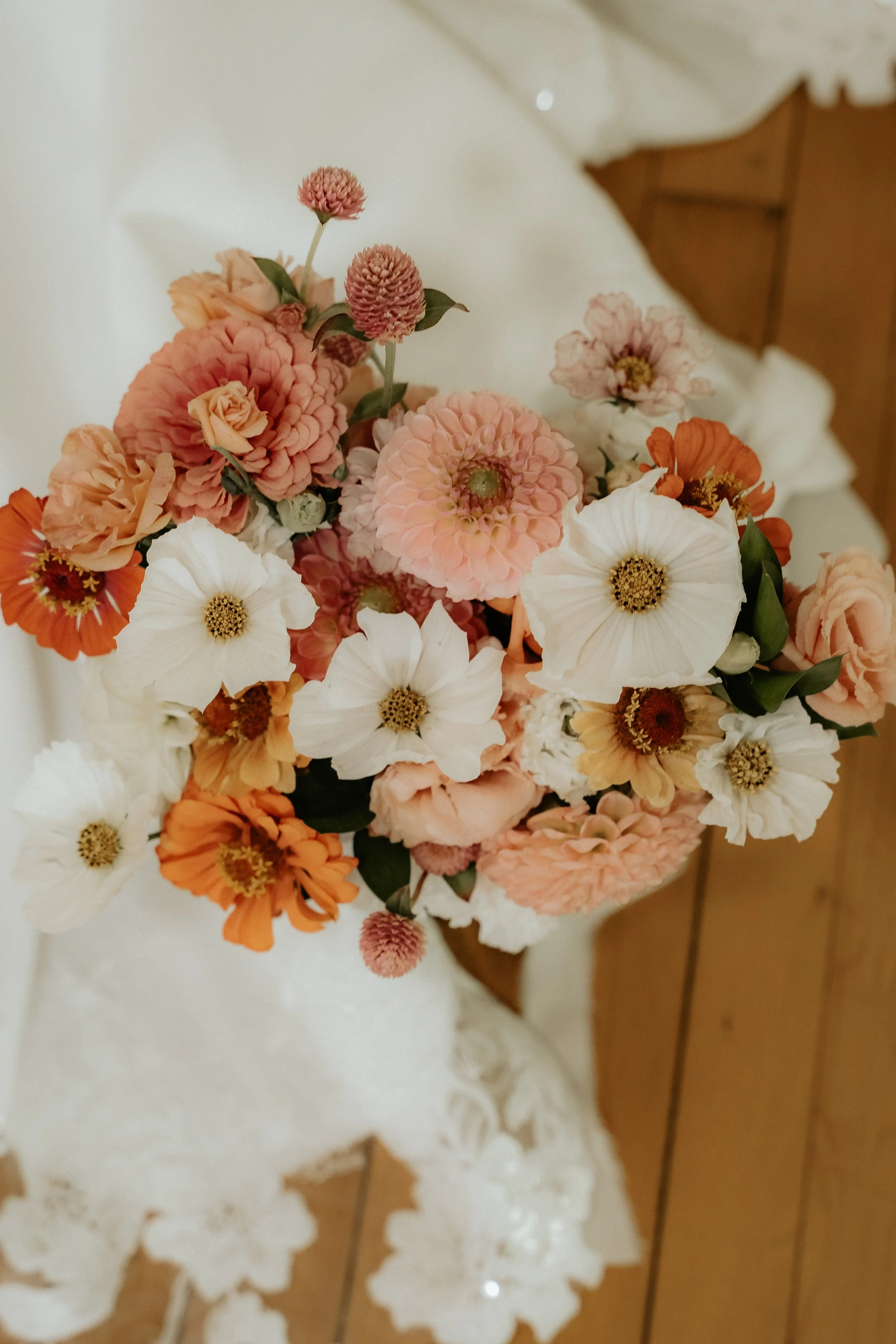 Nos fleurs préférées dépendent clairement de la saison! En mai, un bouquet intégrant du lilas ou un «posy» de muguet ou un bouquet 100% pivoines, en juillet, le delphinium d’un bleu à faire rêver, en septembre, le zinnia avec sa grande variété de couleurs et en octobre, on ne se trompe pas avec les dahlias.